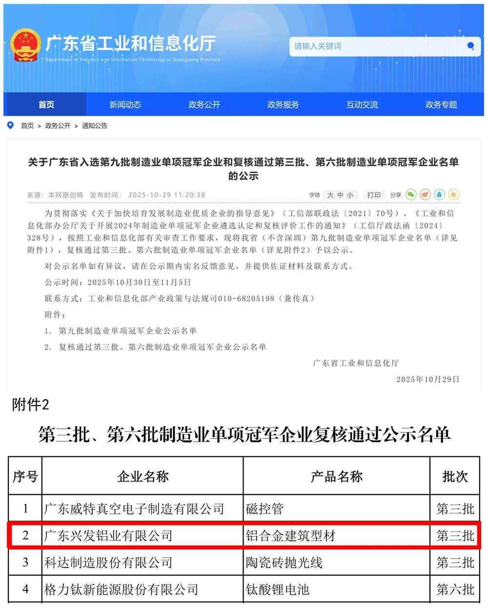 近日,广东省工业和信息化厅发布了《关于广东省入选第九批制造业单项冠军企业和复核通过第三批、第六批制造业单项冠军企业名单的公示》,广东(南海)铝加工产业联盟会员企业——兴发铝业凭借在技术创新、市场引领、产业链整合等方面的综合优势,继2018年认定及2021年复核通过后,今年再次顺利通过复核,摘得此项国家级殊荣,彰显了公司在铝加工细分领域的领先地位。